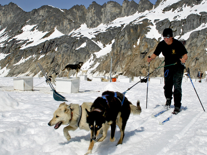 - 스키어가 동물에게 줄을 연결해 끌려가며 경주를 합니다.